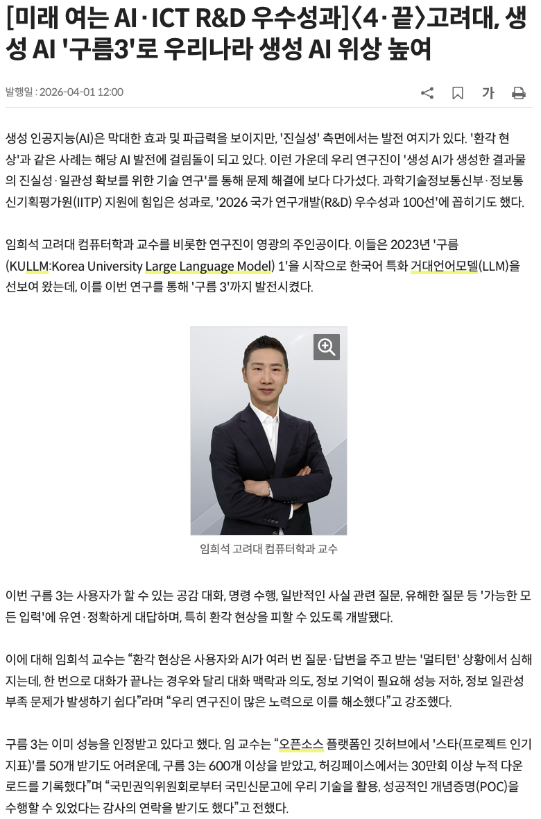 KULLM: Korea University Large Language Model KULLM(구름)은 고려대학교 NLP & AI 연구실과 HIAI 연구원이 개발한 한국어 Large Language Model (LLM) 입니다.KULLM(구름)에 대한 더 자세한 내용은 …